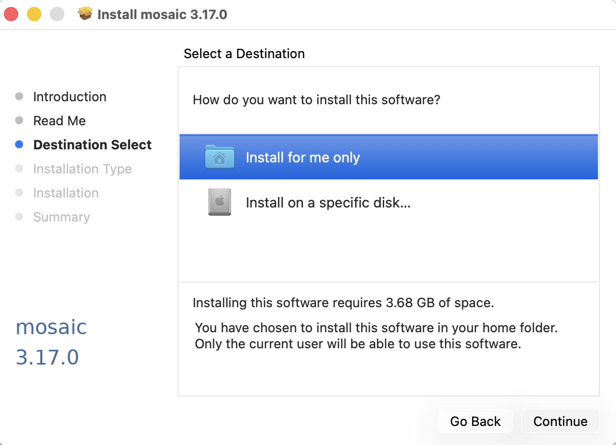 If the answer is “Yes” then proceed with Mosaic installation. If the the answer is “No” then first install Rosetta 2 using the command: